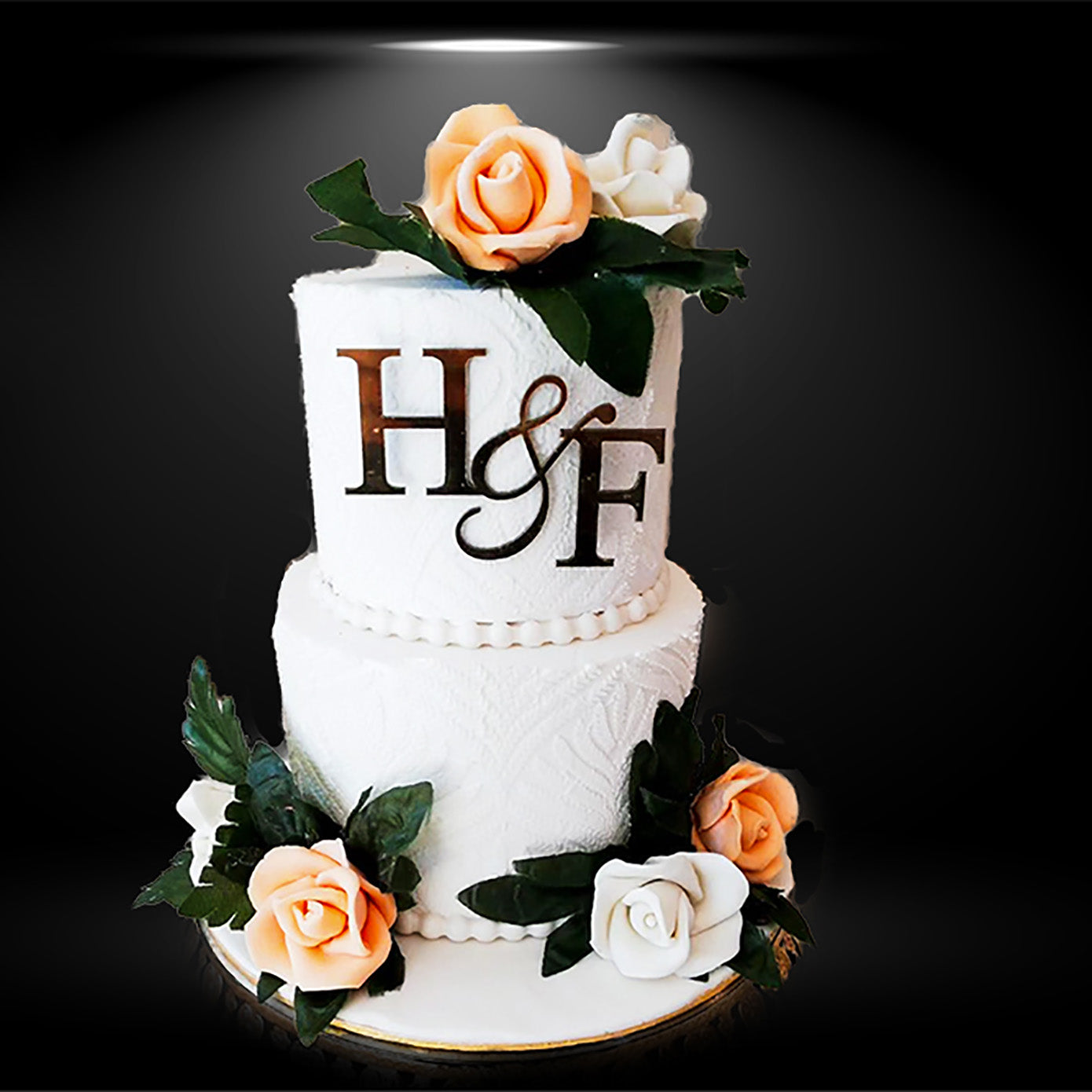 An exquisite cake, that will be center piece of your wedding event, a delicious layering of vanilla and chocolate fudge, decorated with acrylic topper and fresh flower arrangements, do not forget to mention initials of the bride and groom name for the topper, serving size 8Lbs.