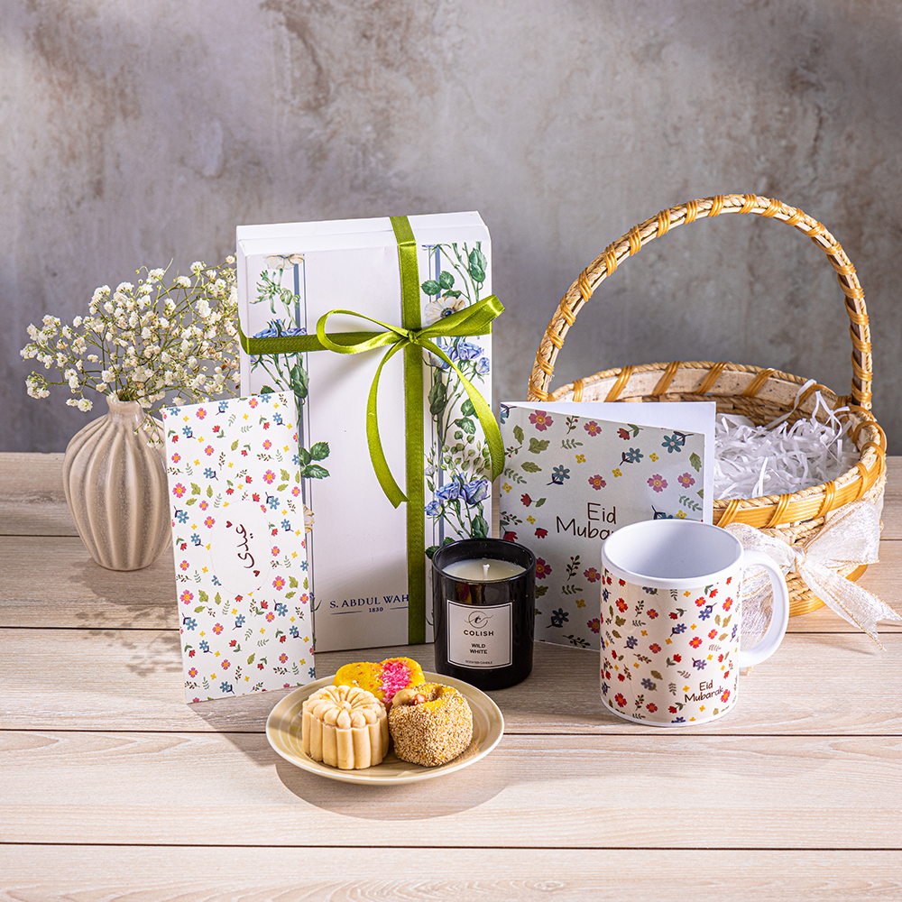 This hamper contains: S. Abdul Wahid assorted mithai box, Eid greeting card with envelope, Colish candle (100 grams), Indus ceramic mug, Baskets (Small 8*8) + Packaging