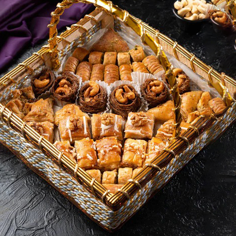Surprise your loved ones with this gorgeous basket from Arabian Delights with their premium range including BirdNest, Baklava, Asabae, Ashe Bulbul, Baloria filled with Pistachio and Cashew Nut!