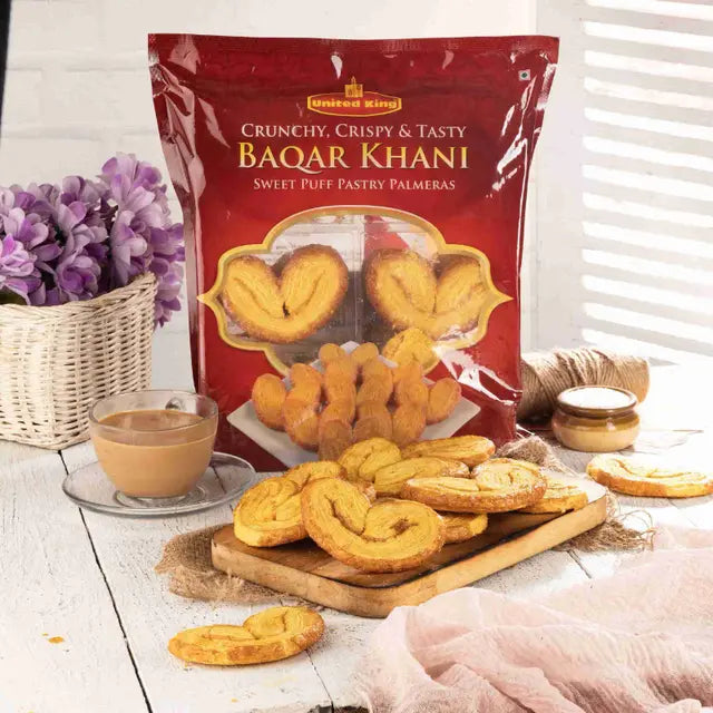 Baqar Khani French Heart is a 200-gram pack of traditional, flaky pastries with a heart-shaped design. These delightful treats are known for their crisp texture and subtly sweet flavor, making them a perfect snack or accompaniment to tea. Enjoy the classic taste of Baqar Khani with a charming French twist!