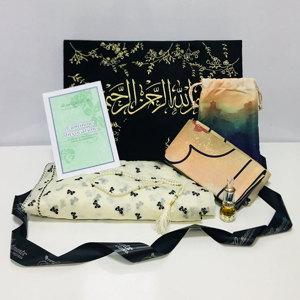 The “Bismillah Black Box” is more than just a gift. It’s a thoughtfully created pack of essentials that accompany one in the journey of faith. It inspires reflection and deepen one’s bond with the Creator. The elegant dupatta, crafted with love, features exquisite embroidery that perfectly complements its soft fabric. The prayer cap, made from a gentle, premium material, pairs beautifully with the calming essence of the Ittar. A dua book and a premium Tasbih is added to further encourage the act of remembrance and worship.