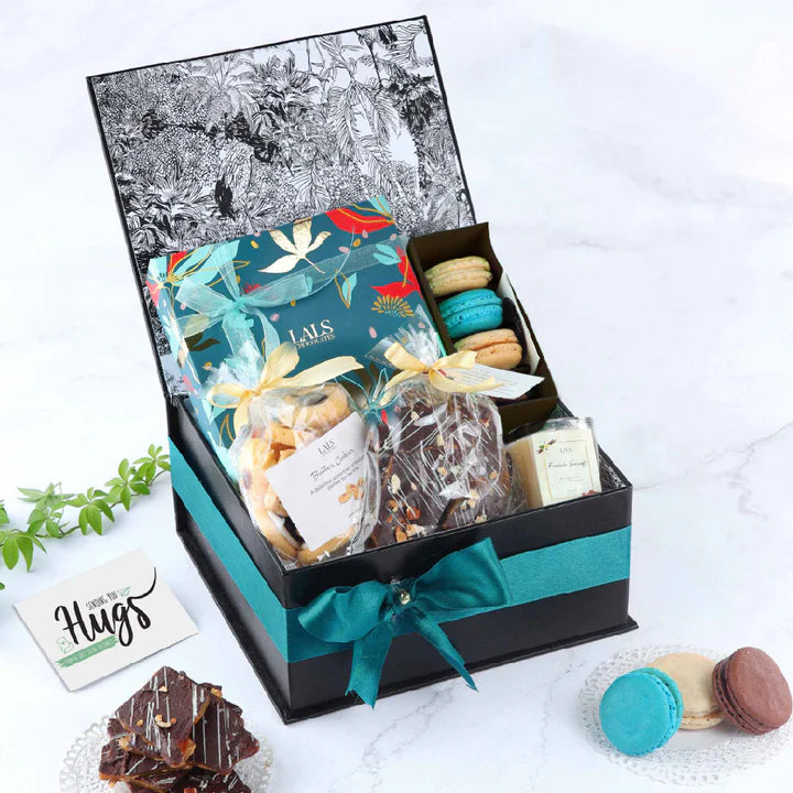 Send chic & delicious greetings to loved ones anywhere in Pakistan. Our Black Toile Hamper filled with decadent chocolates and assorted treats makes a perfect gift. Be sure to include a heartfelt message on the complimentary greeting card for added personalization. Plus this beautiful keepsake hamper can be reused for storage purposes.