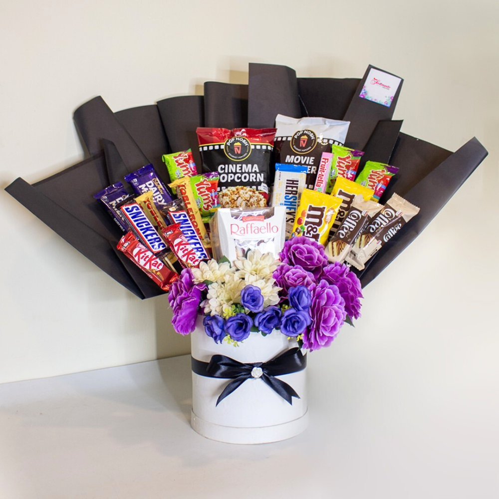 Experience the ultimate movie night indulgence with our Cinematic Bliss Bouquet! Packed with premium chocolates, gourmet popcorn, and an array of delicious snacks, this bouquet is perfect for cinema lovers. Featuring a stunning arrangement of vibrant flowers and movie-time treats, it's the ideal gift for birthdays, anniversaries, or a cozy movie marathon. Surprise your loved ones with this unique and thoughtful snack bouquet! Order now to enjoy fast delivery and elevate any celebration.