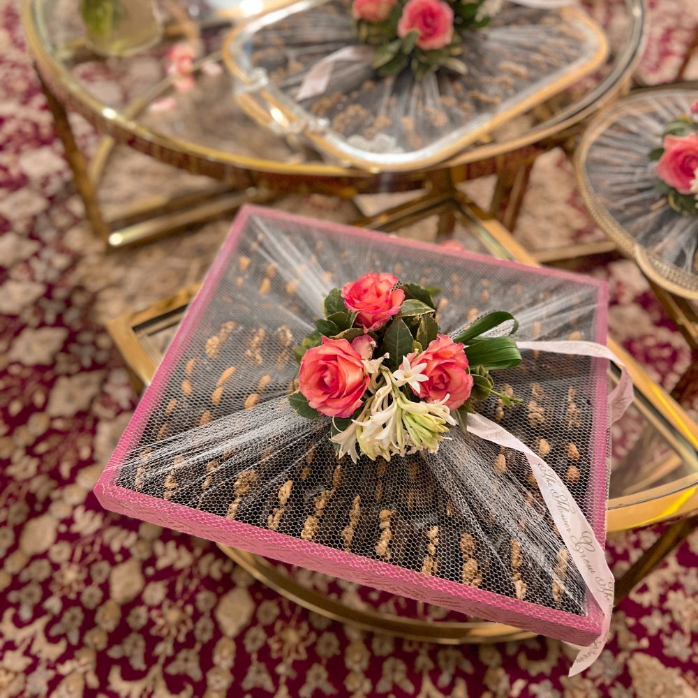 A luxurious 1 kg platter of premium dates, each generously stuffed with a variety of delicious dry fruits. Beautifully arranged on a hand-painted wooden tray, the platter is wrapped in delicate netting and topped with fresh florals, creating a visually stunning and indulgent gift. Perfect for festive occasions, celebrations, or as a thoughtful token of appreciation, this platter combines elegance, flavor, and craftsmanship in one exquisite presentation.