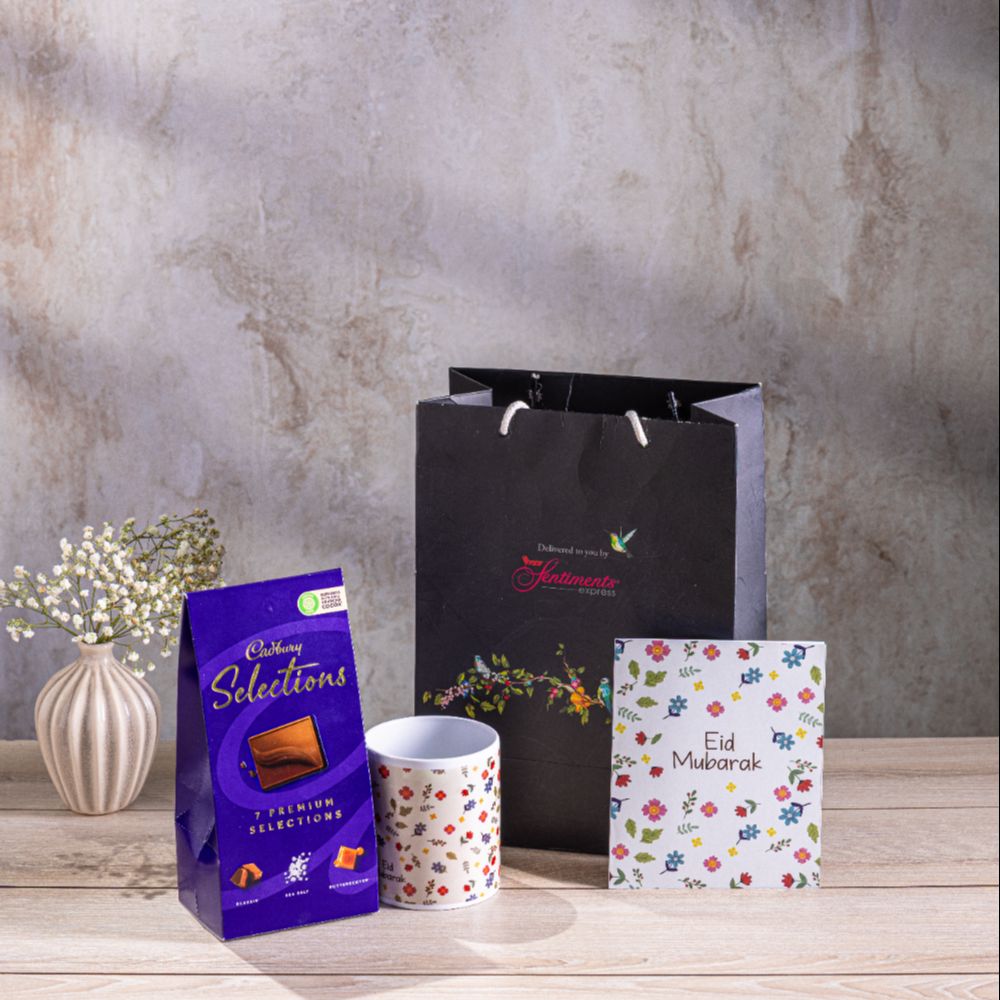 This hamper contains: Cadbury Selections chocolate box (Small), Eid mug, Eid greeting card, Goodie bag, and a simple bundle of joy for Eid.