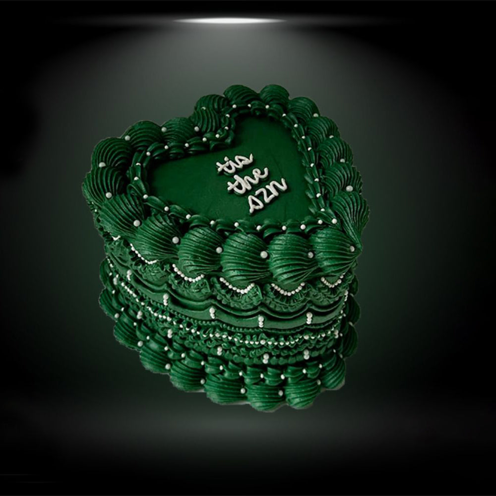 Indulge in the opulence of our Emerald Love Heart Cake, a stunning masterpiece crafted for special occasions. Shaped to perfection in a radiant heart, this 3-pound dessert is infused with the rich and decadent flavors of chocolate fudge. Its smooth emerald green exterior, created with premium buttercream, exudes sophistication and is accented with delicate golden embellishments. Beneath its vibrant surface, layers of moist chocolate fudge cake are filled with velvety chocolate ganache, delivering an exquisite taste that’s sure to captivate every chocolate lover. Ideal for celebrations that call for a touch of elegance and a burst of flavor.