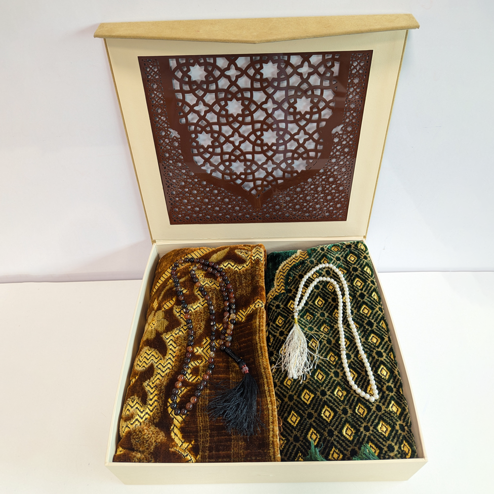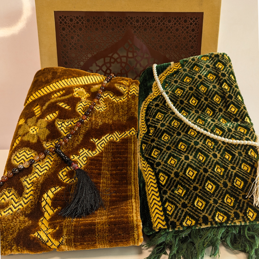 A beautifully curated set for couples, featuring a green Janamaz, a golden Janamaz, a white pearl Tasbih, and a black/brown stone Tasbih (100 beads) to share moments of faith together. It conists of: