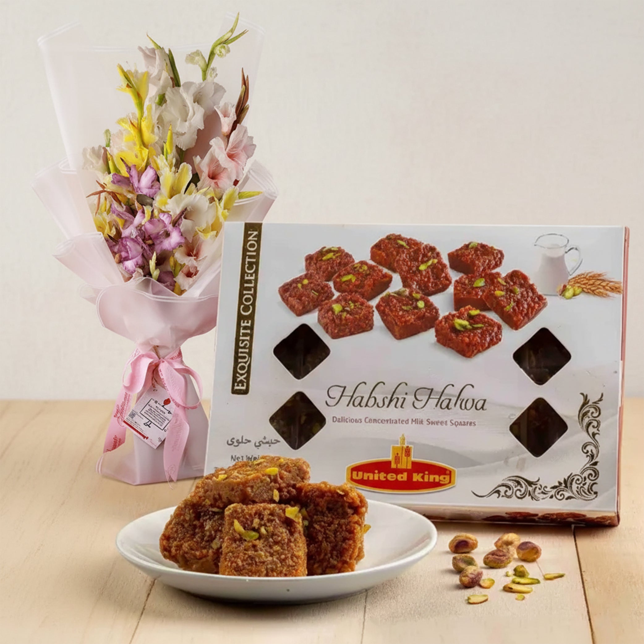 Sweet nostalgia meets floral serenity in this winter-ready combo. Habshi halwa brings back the taste of tradition, while soft gladiolus blooms light up cozy nights indoors, a perfect companion to a quiet winter’s evening.