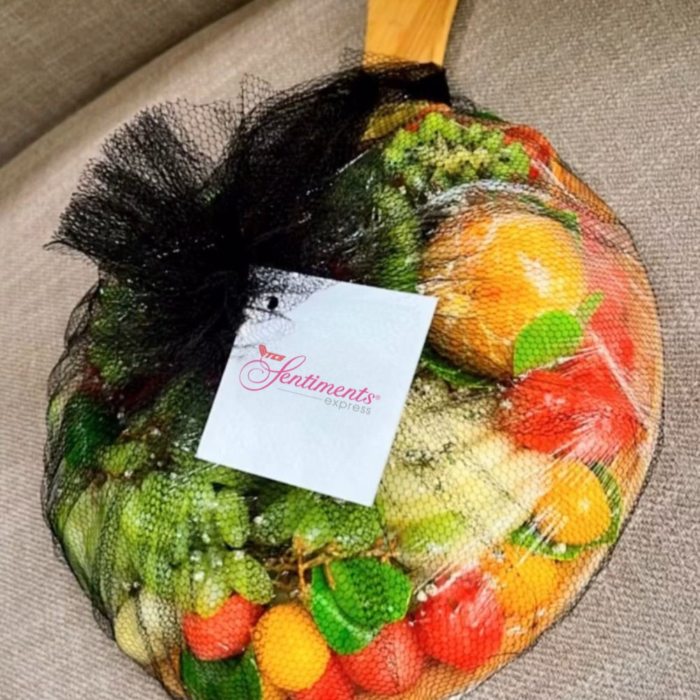Assorted seasonal fruits packed in a decorated 12-inches wooden platter.