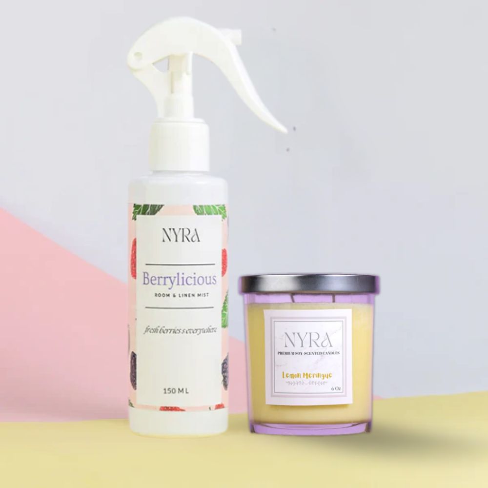 Brighten your space with this refreshing duo. The Nyra Lemon Meringue Candle offers a zesty, sweet aroma, while the Nyra Berrylicious Mist adds a burst of fruity freshness to your room and linens. Perfect for uplifting any environment.