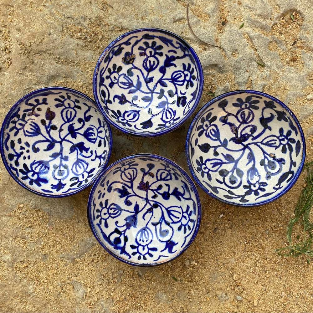 A handcrafted piyala in a classic blue and white combination, made by the Kashigars of Hala, Sindh. This single, finely detailed piece embodies the rich tradition of handmade pottery.