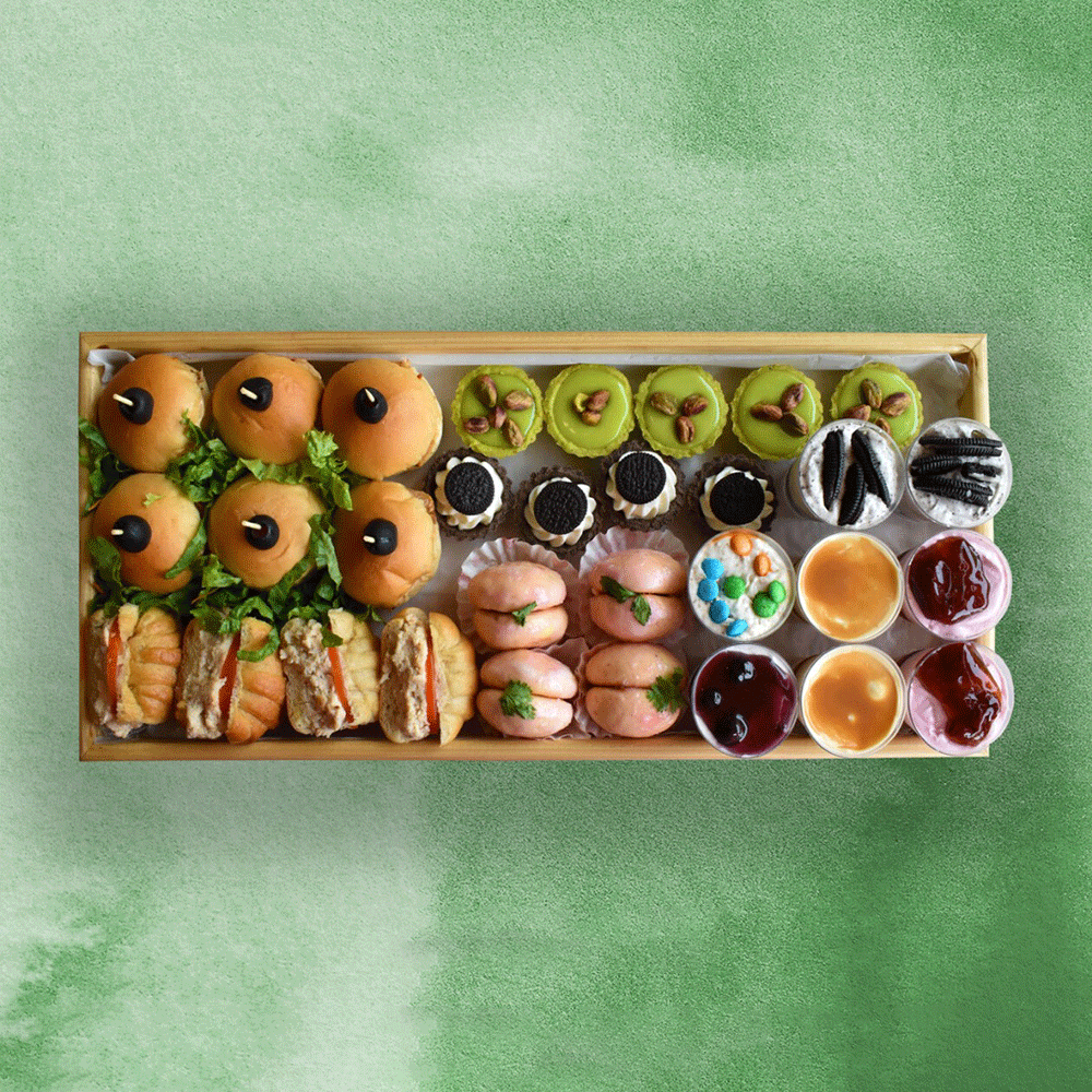 * Mini Chicken Burgers * Mini Chicken Croissants * Peach Cookies * Oreo Tarts * Pistachio Tarts * Oreo Cheese Cakes