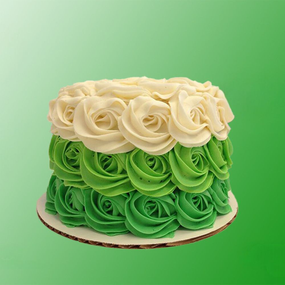 A beautifully decorated green and white ombre cake in chocolate fudge flavor, serving size 2Lbs