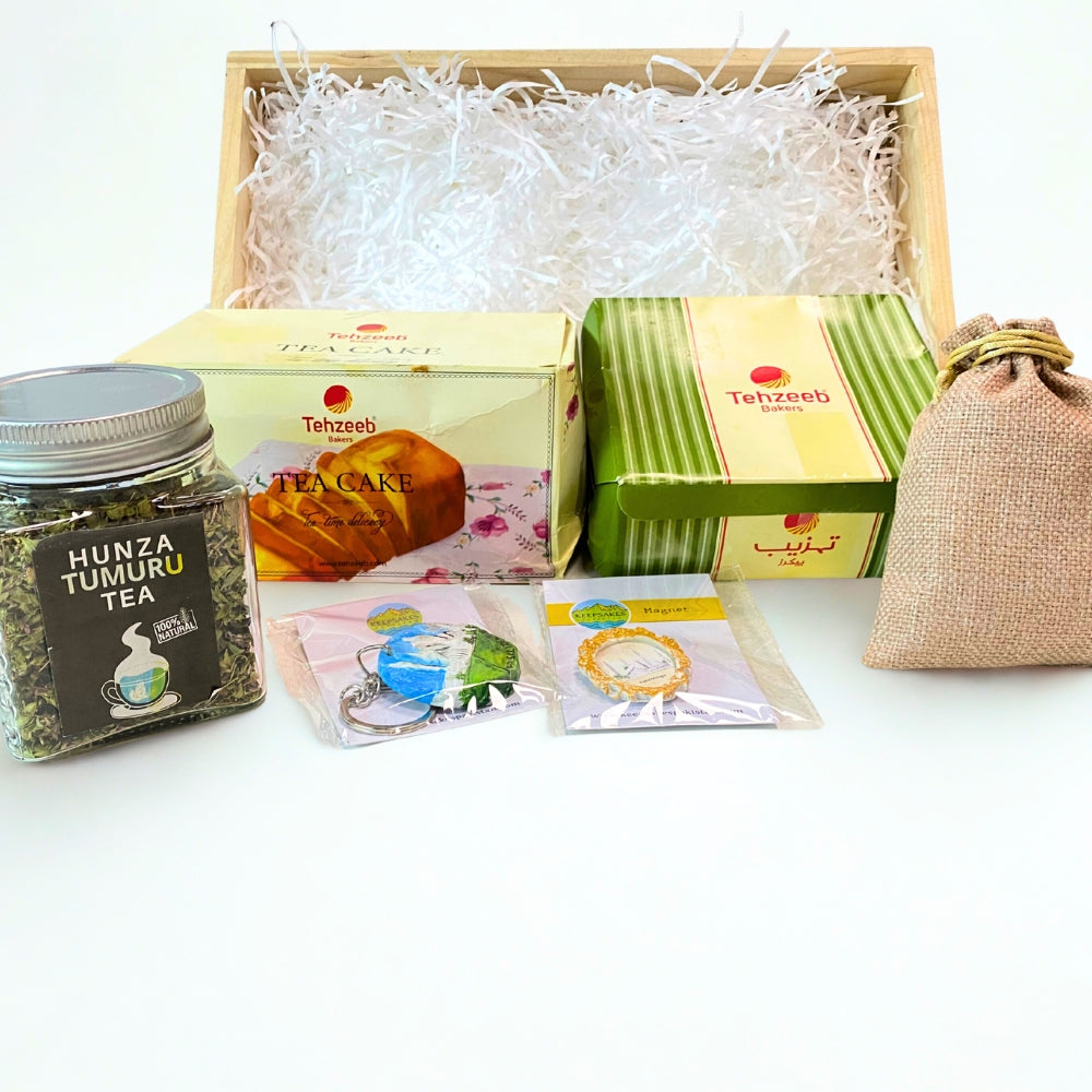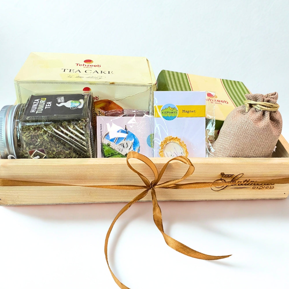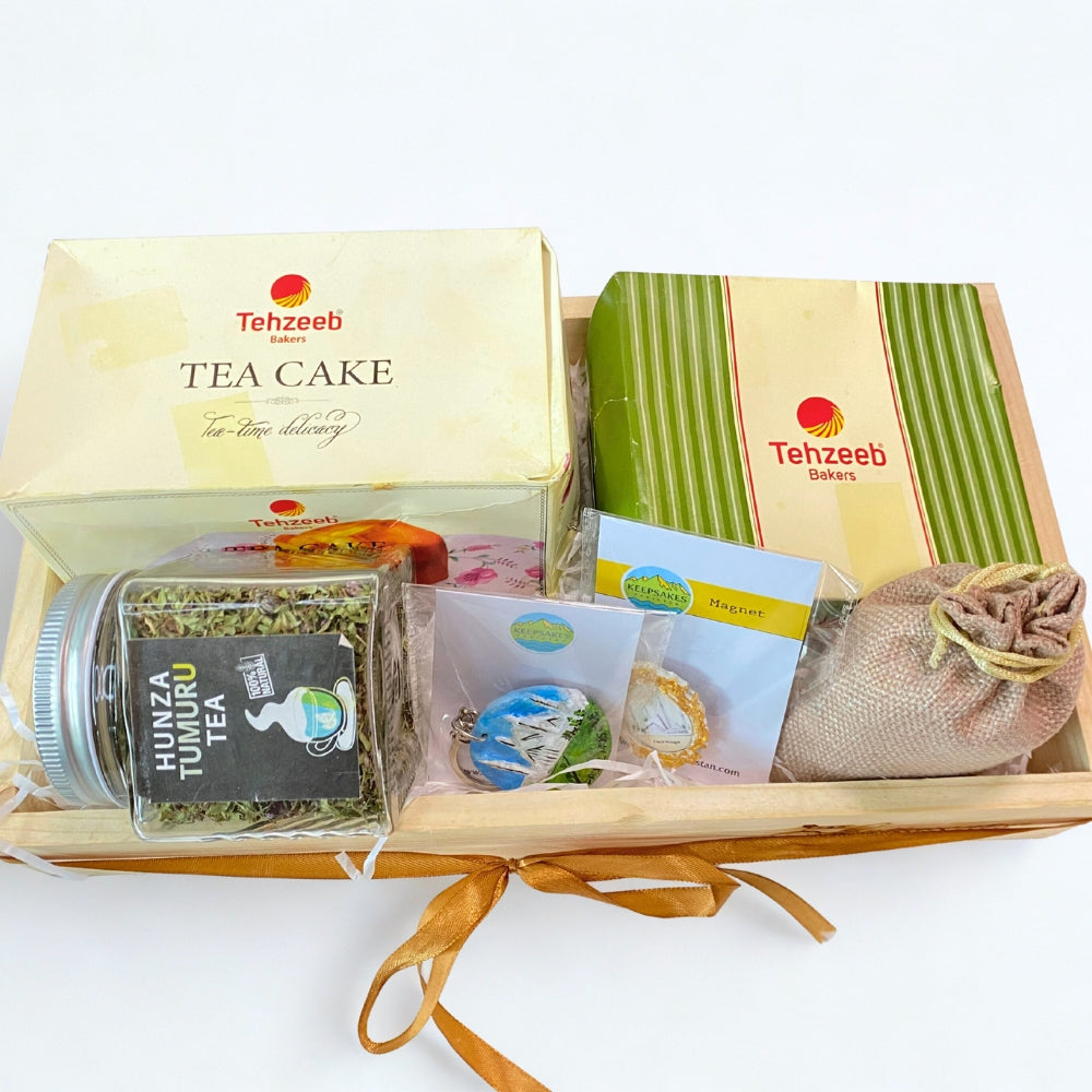 Nestled between the hills and known for its calm charm, Islamabad is a city of serenity and taste. This basket brings together iconic flavours from Tehzeeb Bakers, wholesome dry fruits, and the soothing aroma of Hunza’s Tumuru Tea – Wild Thyme. To complete the experience, keepsakes of the majestic Faisal Mosque capture the city’s spirit of grace and modern tradition. A thoughtful gift that reflects the peaceful heart of Pakistan’s capital.