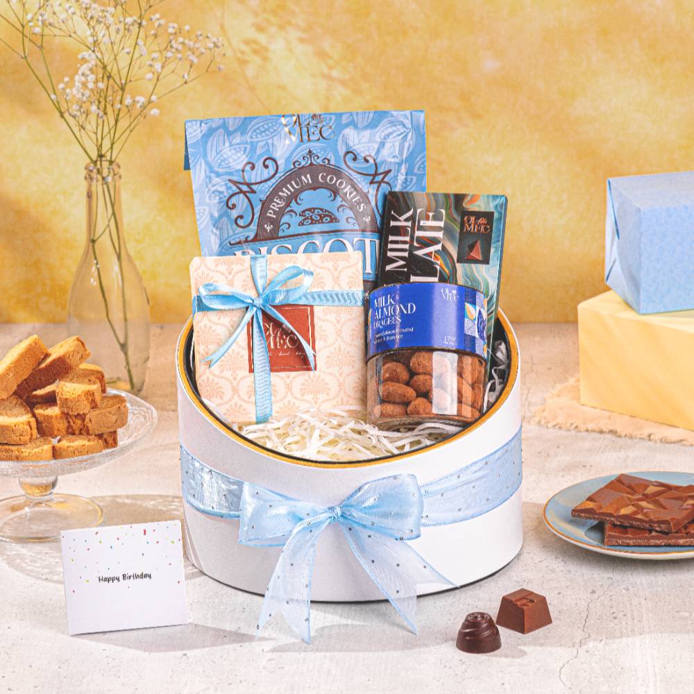 A bright white hamper made to celebrate their special day. Includes a Heritage Box of 4, almond biscotti, milk almond dragees, and a premium milk chocolate bar. Finished with a sparkly blue ribbon and a Happy Birthday card — sweet, simple, and ready to party. Reusable gift basket — perfect for treasuring or re-gifting.