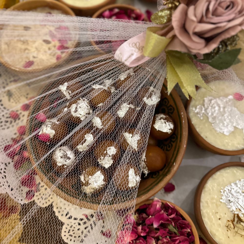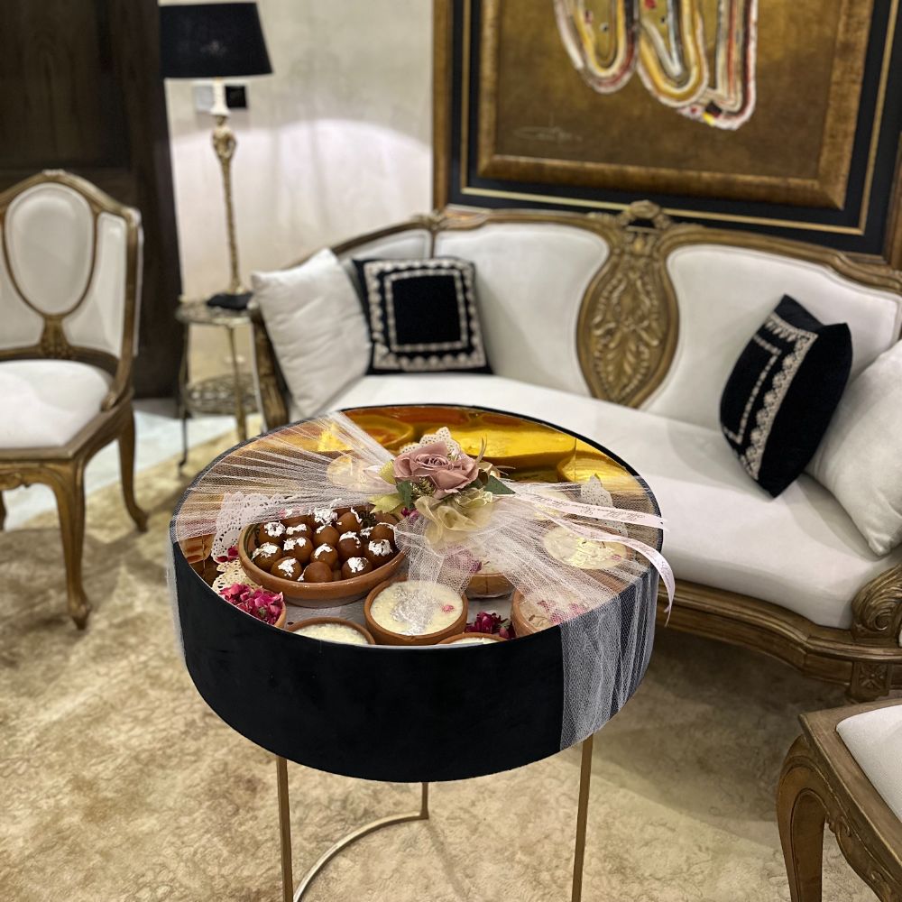 A grand, handcrafted wooden thali beautifully arranged with traditional desserts — creamy kheer, and 1 kg of soft, syrupy gulab jamun. Adorned with fresh rose petals for a touch of elegance, this indulgent platter perfectly blends classic flavors with a luxurious presentation — ideal for gifting or festive celebrations.