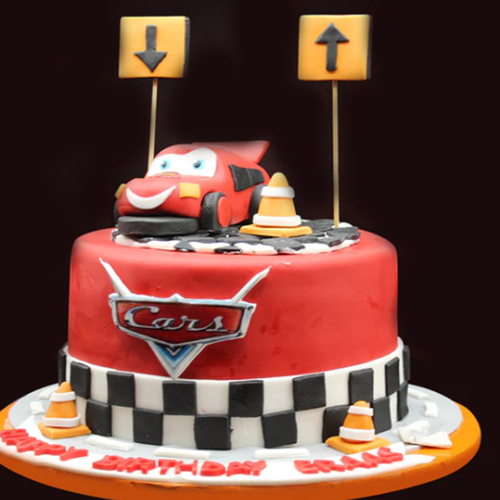 This Mc Queen Theme Birthday Cake is the perfect gift for car lover kids! This 5Lb cake by Sacha's is made with Belgian chocolate fudge and features a car theme for a fun and unique experience. Guaranteed to bring joy to any event!