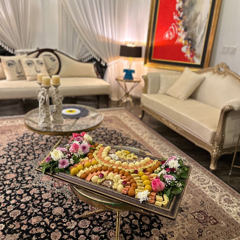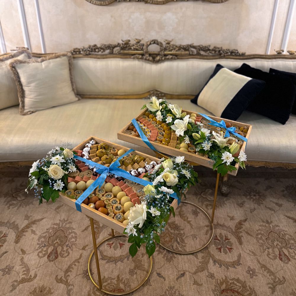 Comes in a wooden tray, mithai is sourced from the best in town; JamilSweets or Fressco. Florals will depend on avalability, can hold up to 5kg worth mithai.