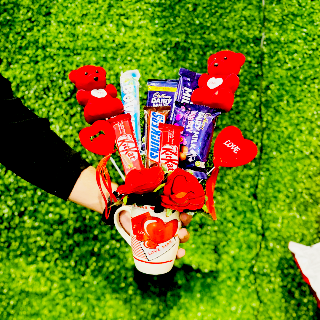 Embrace warmth and sweetness with our delightful custom basket, designed to brighten any day. This thoughtful ensemble includes a charming mug, perfect for sipping your favorite beverage in comfort. Alongside the mug are two adorable bears, adding a touch of cuddly companionship to the gift. Complementing these heartwarming elements are fresh flowers, bringing a burst of color and fragrance to the arrangement. And of course, no gift would be complete without a selection of indulgent chocolates! Treat yourself or someone special to two KitKat bars, one Bounty bar, one Snickers bar, one Bubbly chocolate, and two Dairy Milk chocolates. Each item is carefully arranged to create a delightful presentation, making this custom basket the perfect choice for spreading joy and sweetness on any occasion.