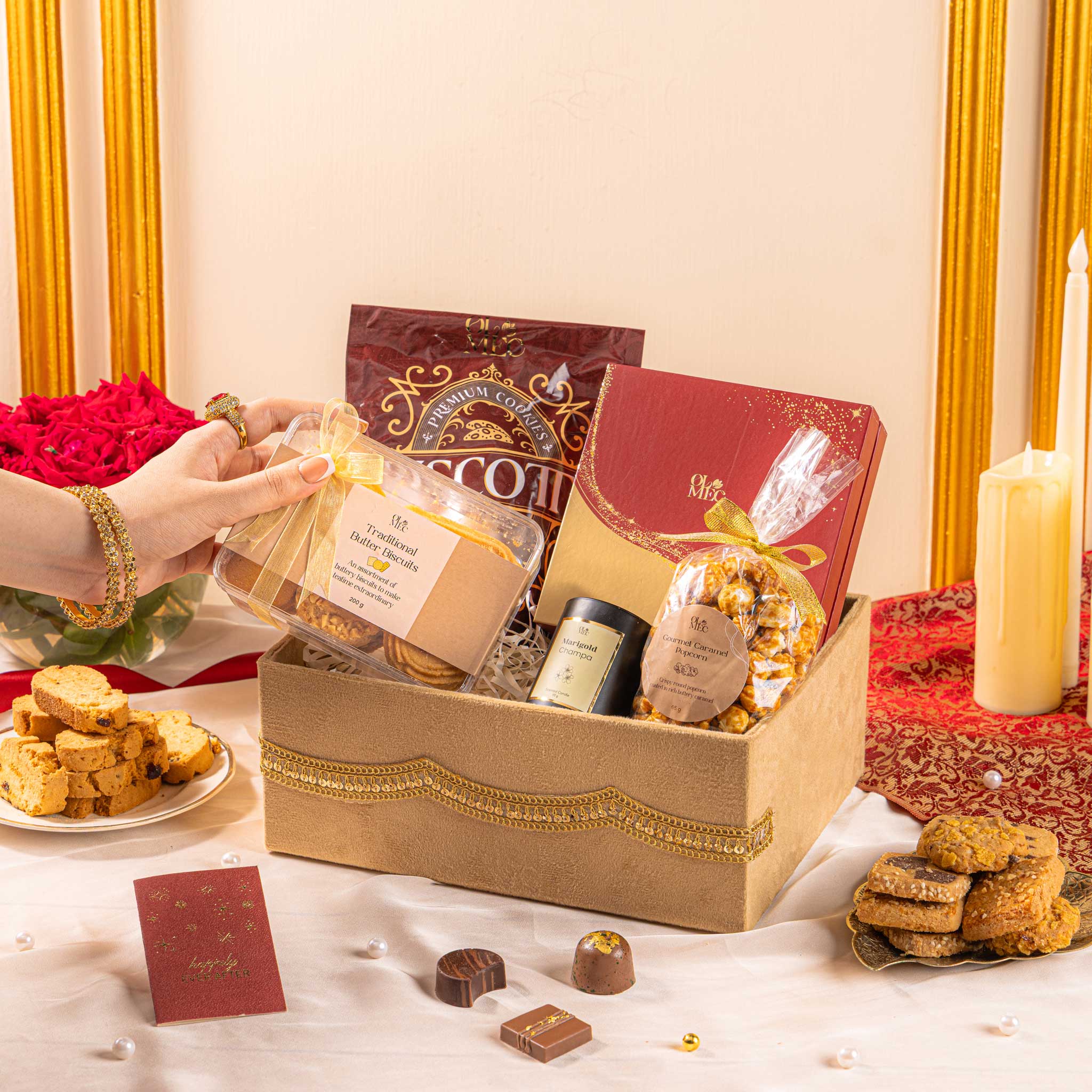 A romantic keepsake hamper with bon bons, gourmet popcorn, and a candle — designed to sweeten your nikkah moments.