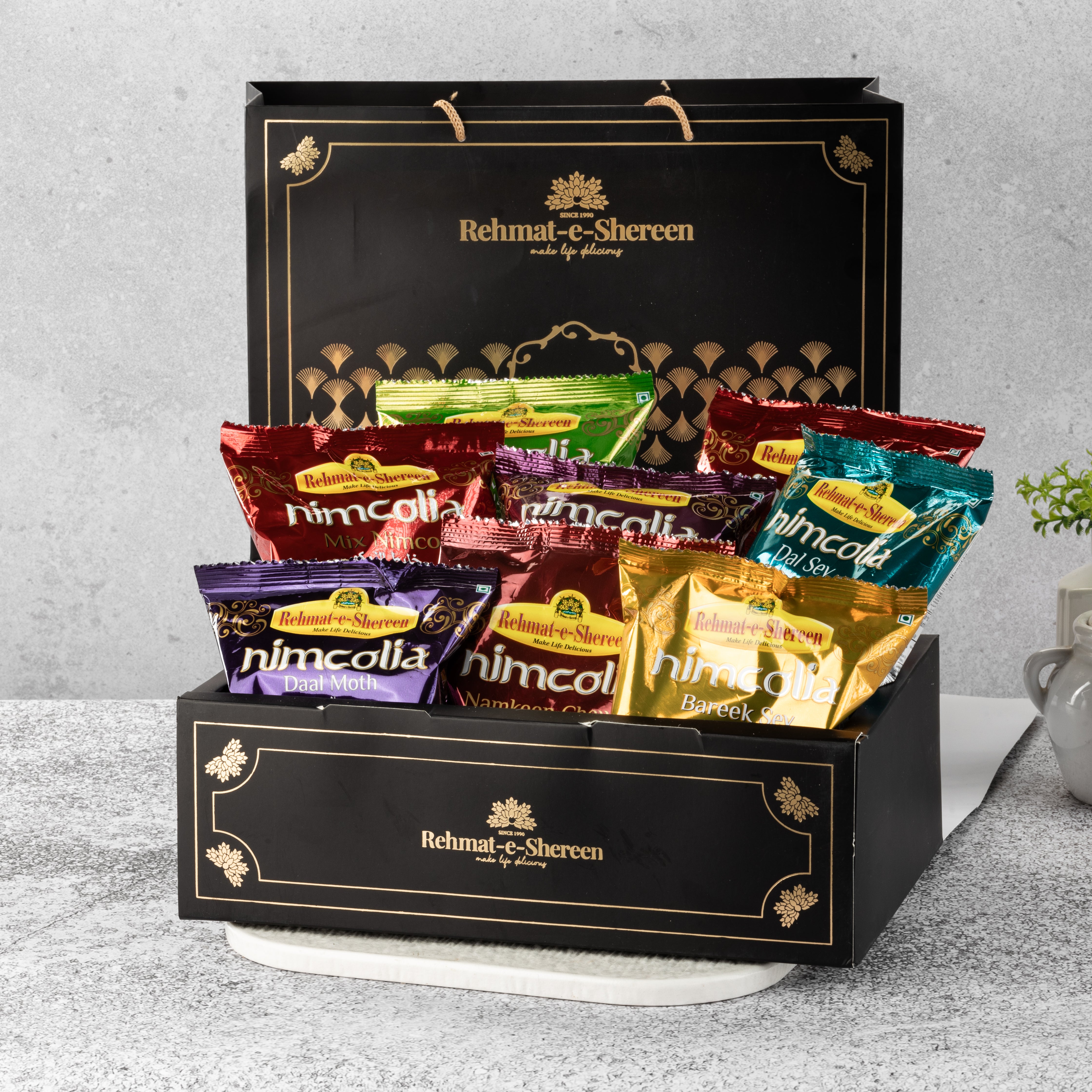 Nimco Gift Pack, a perfect assortment of savory delights including Daal Mong, Mix Nimco, Daal Moth, Meetha Chewra, Daal Sev, Namkeen Chewra, Bareek Sev, and Gathia.