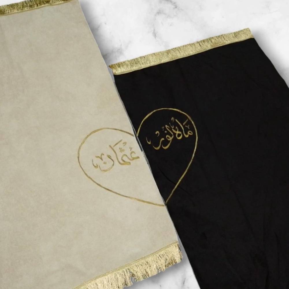 This beautifully crafted pair of personalized prayer mats is the perfect gift for couples or loved ones, especially during the blessed month of Ramadan. Made from soft, high-quality fabric, these prayer mats offer comfort and durability for daily prayers. Each mat can be uniquely personalized with names elegantly embroidered in Arabic, creating a special connection between the two. Whether for newlyweds, a cherished partner, or close friends, this thoughtful gift symbolizes devotion and love. These matching prayer mats not only enhance the spiritual experience but also make a lasting, meaningful gift that can be treasured for years to come.