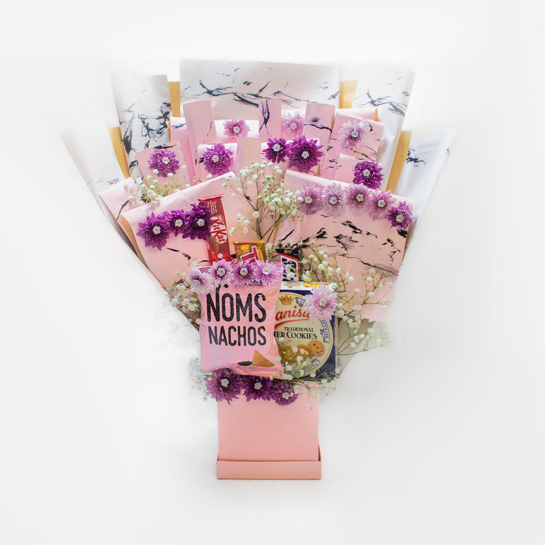 This indulgent basket is loaded with both sweet and savory favorites. It includes Lays French Cheese, Macho Nachos Hotlicious Tortilla Chips, Popnosh Choco Loco, Bisconi Cake Rich Lotus, Lays Wavy, and Bisconi Cake Rich Coffee. For chocolate lovers, it features a DairyMilk Bubbly, Nomis Nachos Salt & Pepper, Macho Nachos, Mars, Twix, Toblerone Milk, Bounty 2X, DairyMilk Oreo Red, Snickers Bar, Danisa Butter Cookies, KitKat 2 Fingers, and a classic DairyMilk.