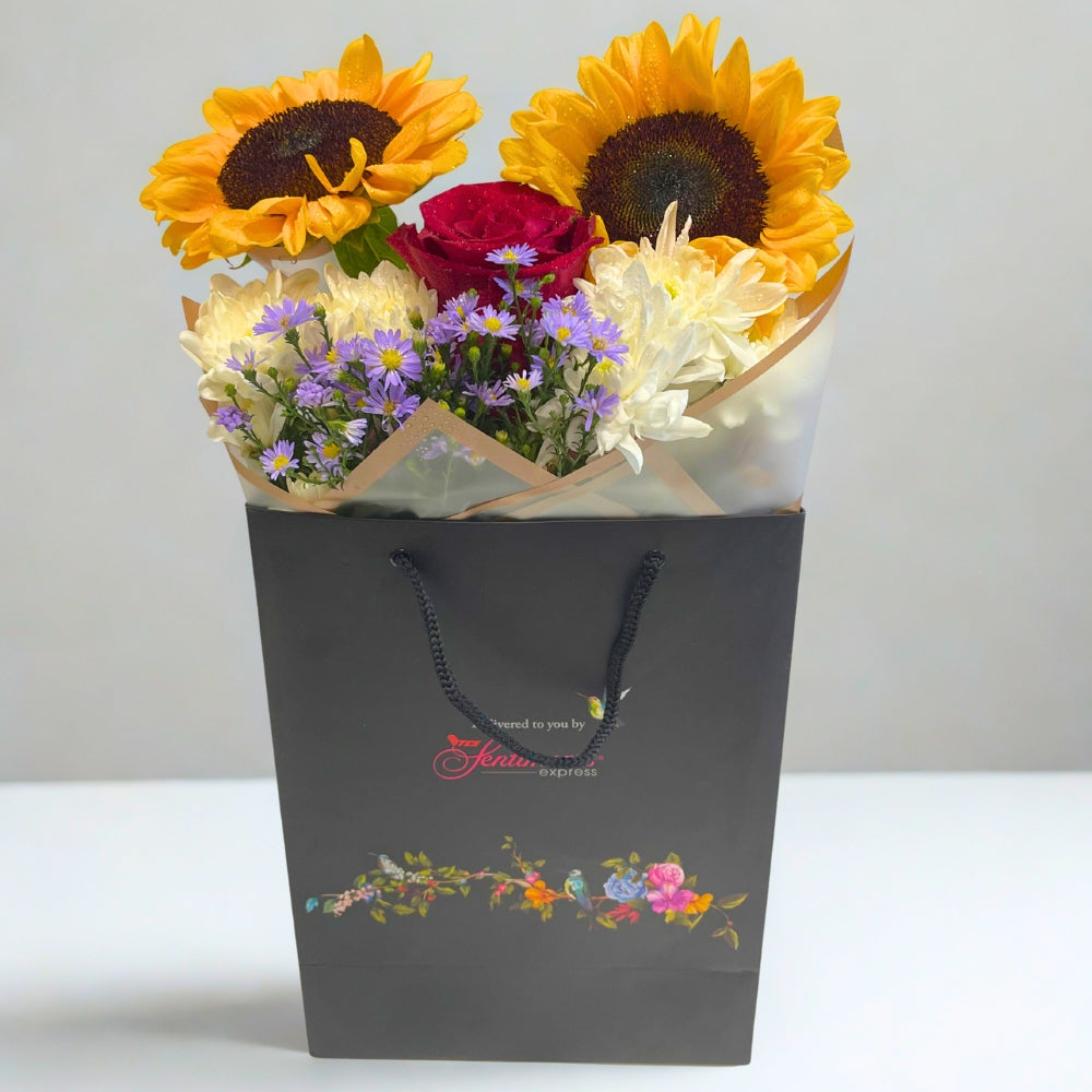 A little bundle of joy, bright as the morning sun. With golden sunflowers, a single rose, and cheerful daisies peeking from a chic black bag, this gift carries happiness in every petal — ready to make someone’s day shine.
