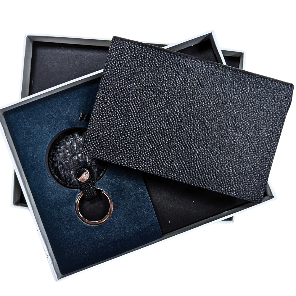 Our luxury Mini notebook and Keychain set is available in black and navy color with customization of upto 3 letters with sliver foil or debossing.