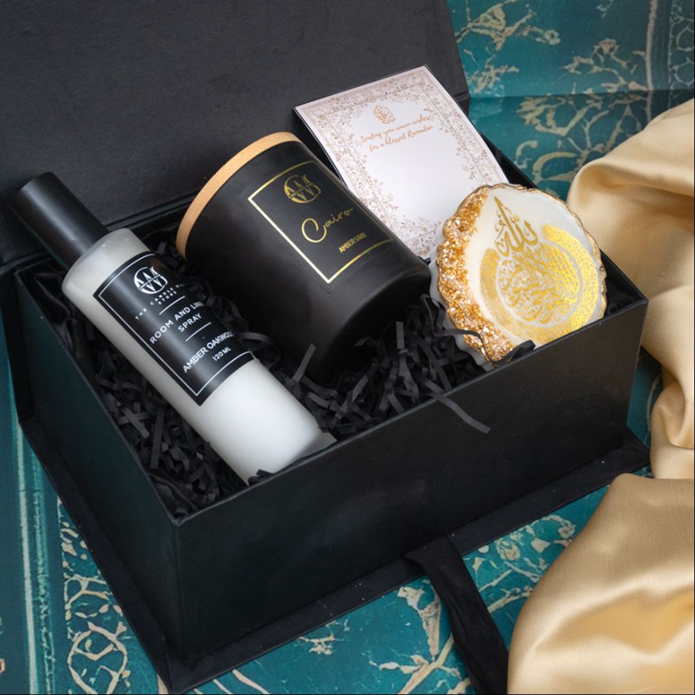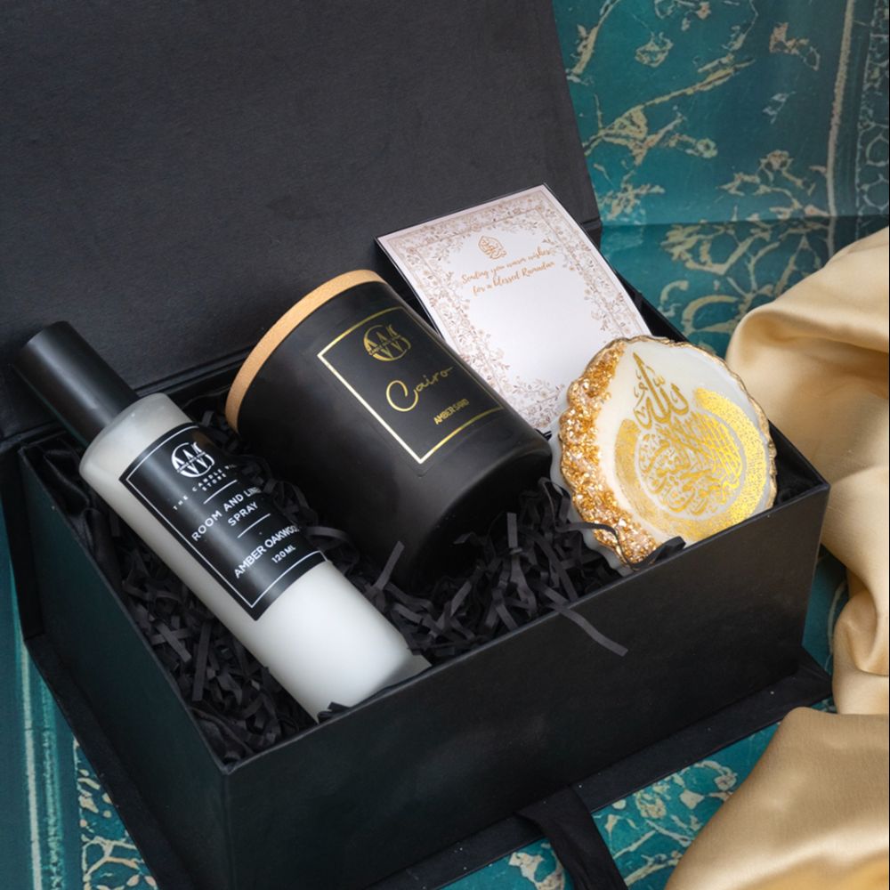 Embrace the essence of Ramadan with this thoughtfully curated gift box, designed to infuse your home with serenity and warmth. This set includes our Oudh Diffuser, to fill your home with a rich, long-lasting fragrance that lingers beautifully. The Regular Pillar Candle adds a warm, comforting glow, perfect for quiet moments of reflection or setting a peaceful atmosphere during suhoor and iftar. The Coaster is a sophisticated addition to your table, while the Ramadan Card serves as a heartfelt reminder of the season’s blessings. Beautifully packaged in our signature black gift box, this set is an ideal way to embrace the Ramadan spirit or share its warmth with loved ones.