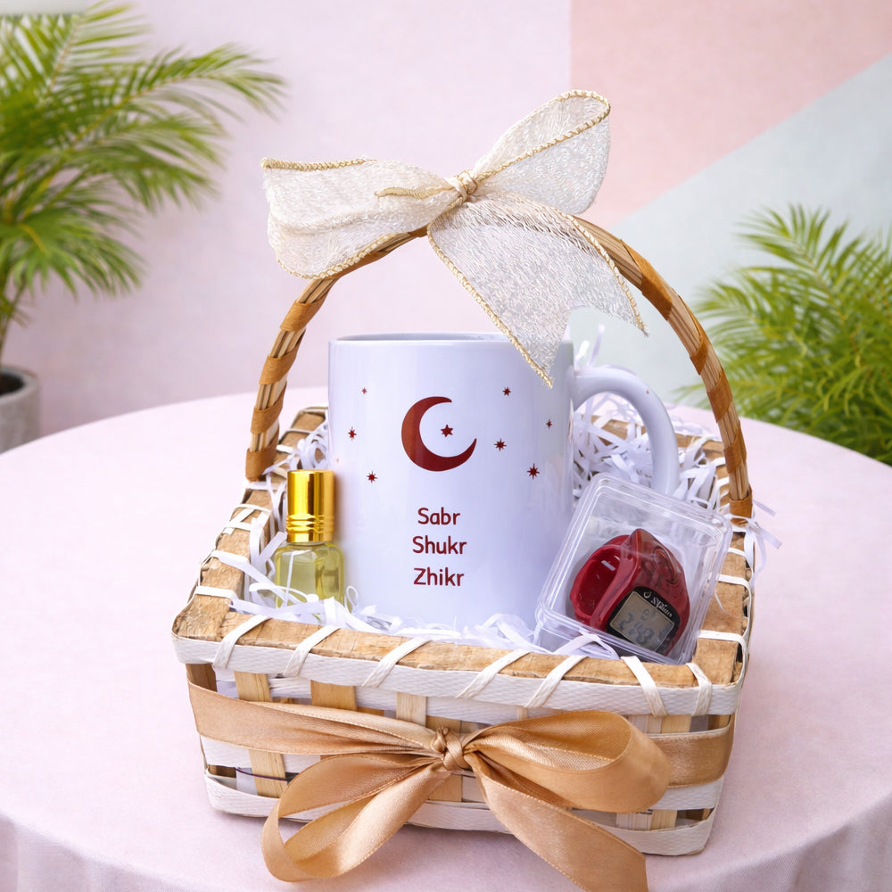 A “Sabr Shukr Zhikr” mug paired with tasbeeh and fragrance oil, a meaningful everyday reminder this Ramadan.