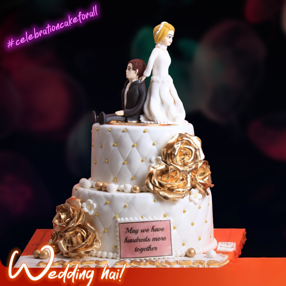 2 Tier Wedding Reception Cake In White & Golden Theme -Fondant Cake -12lbs