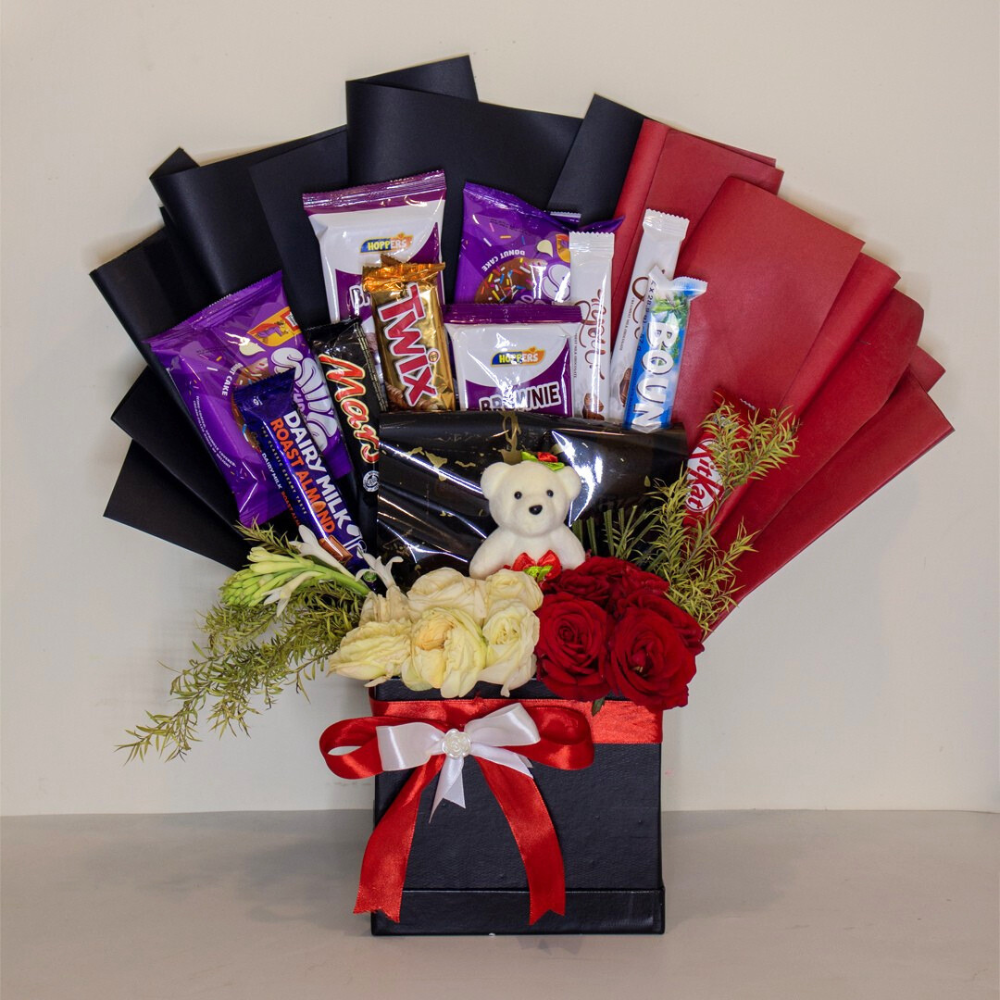 Rosy Treats is a delightful combination of elegance and sweetness, perfect for any special occasion. Featuring luscious red and white roses, a charming teddy bear, and an assortment of premium chocolates like Twix, Dairy Milk, and more, this gift bouquet is designed to impress. Ideal for birthdays, anniversaries, or heartfelt surprises, Rosy Treats is a thoughtful way to express love and appreciation. Order now to make your moments sweeter!