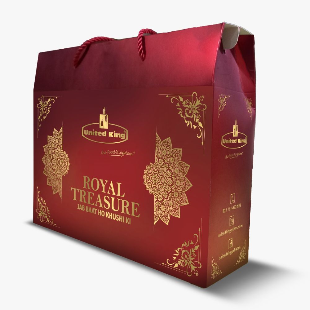 Royal Treasure box includes Assorted sweets, Soan Papdi, Namkino Crunchy Nut Mix, Biscotti Chocolate, Nimco All in one Mix