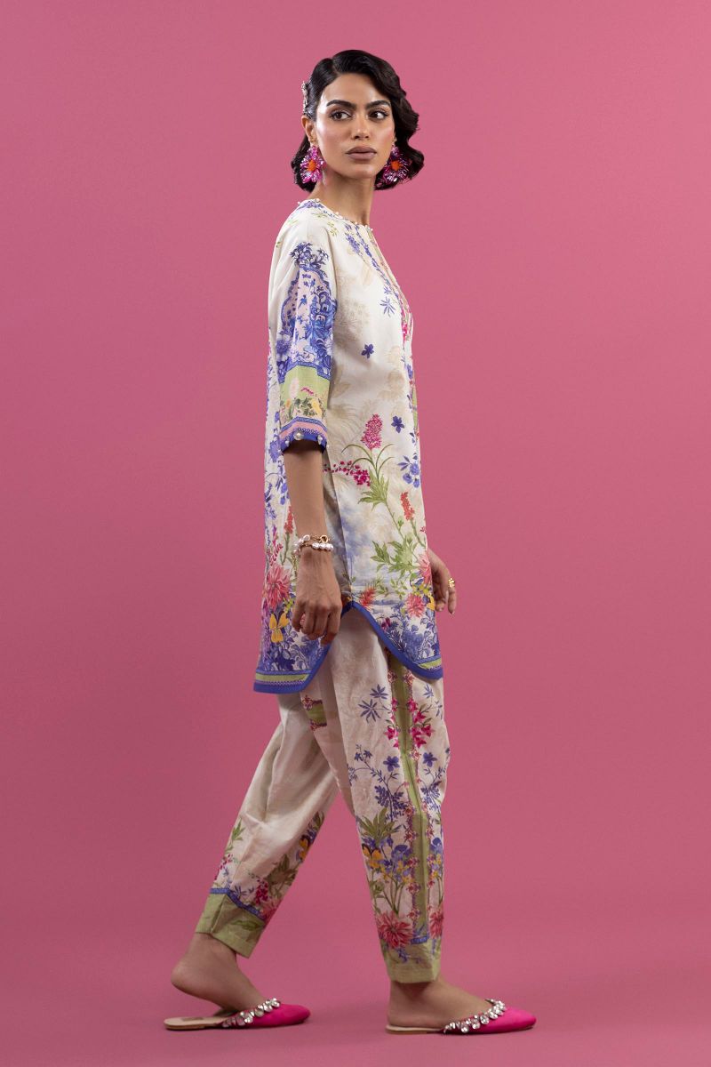 Floral printed shirt on beige lawn base along with same color matching pants in shades of purple, lavender and red.