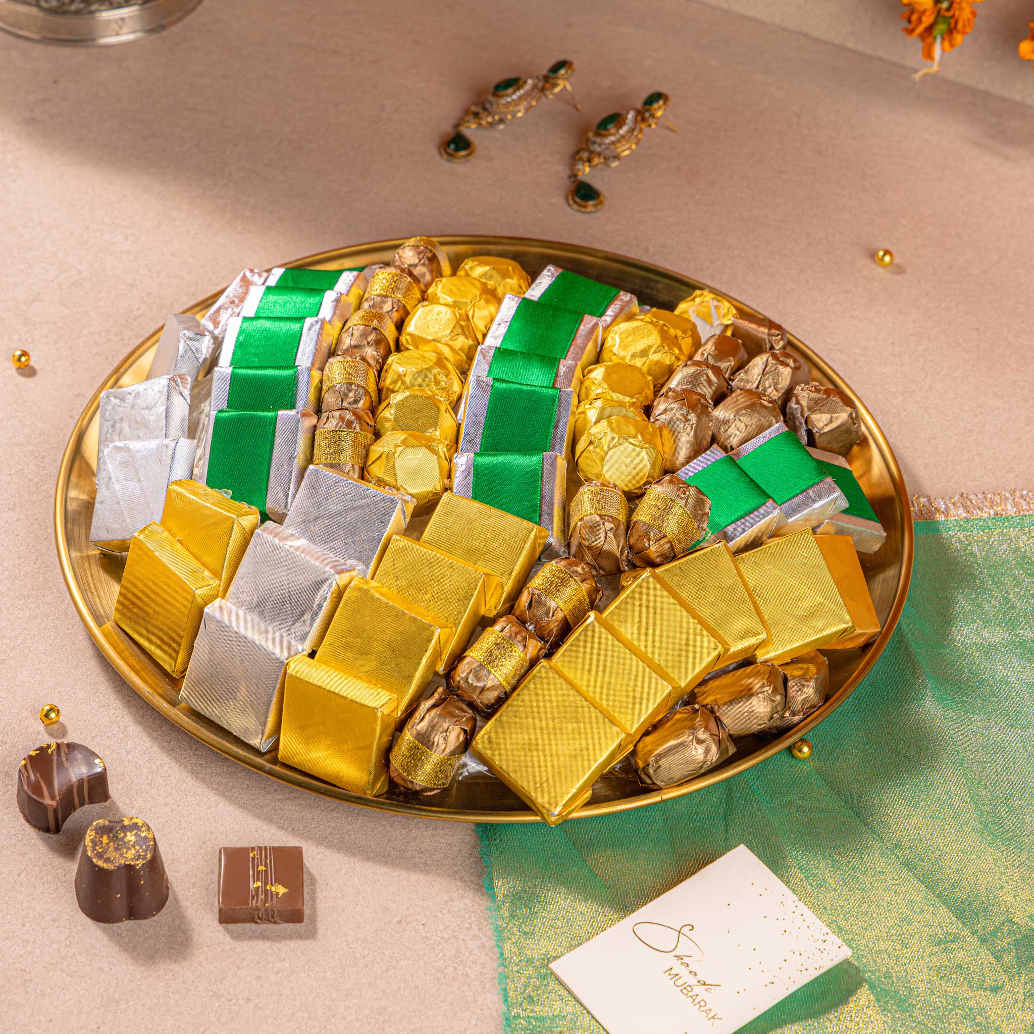 A grand token of celebration, the Shaadi Mubarak Platter features decadent chocolate bon bons arranged on a luxurious round gold platter, tied with an elegant emerald green ribbon.