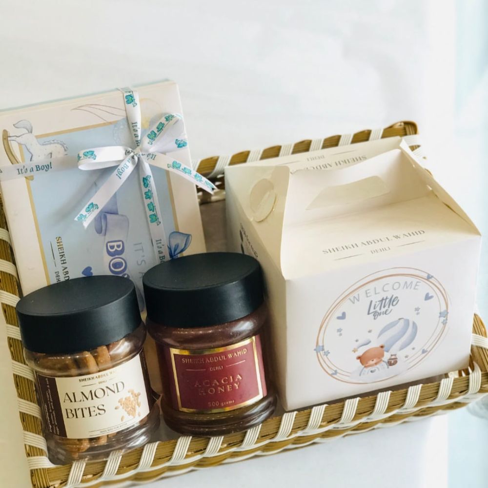 Basket Filled with Almond Bite, Acacia Honey, 8 PCS Signature Box, Rasgullah Handi.