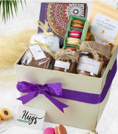 Mandala with Classic Chocolates (9pc) Honey roasted granola (100 gms) Assorted French Macarons 4pc Chocolate bark (150 gms) Almond biscotti jar (100 gms) Chocolate almond spread (100 gms) Butter cookies (150 gms)