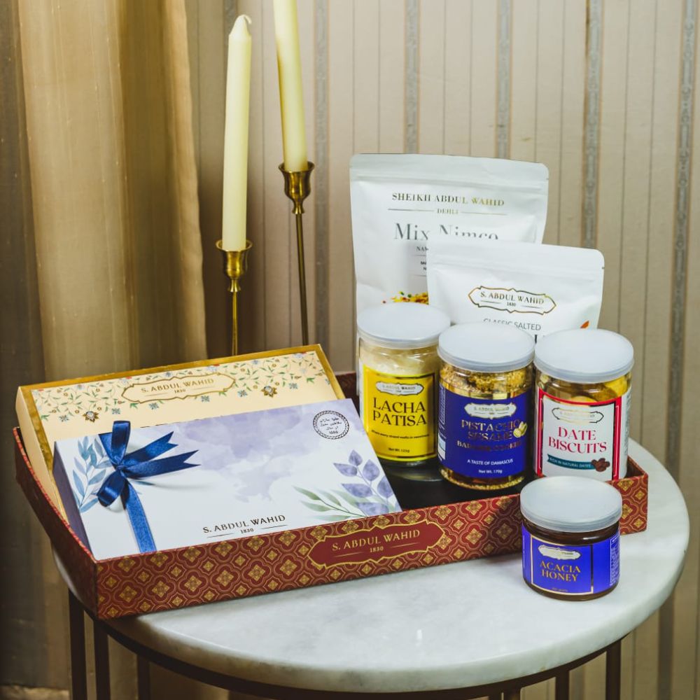 8 PC Sweet Box + Persian Biscuits + Mix Nimco + Salted Makhana + Date Biscuits + Barazek Cookies + Lacha Patisa + Acacia Honey