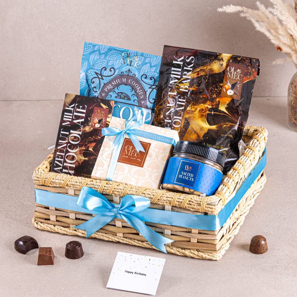 A thoughtfully crafted mix of sweet and savory favorites — from rich chocolates to crunchy nuts, all beautifully presented in a grass basket. Contents: • Classic Almond Biscotti (150g)• Heritage Box of 9 Bon Bons• Hazelnut Milk Chocolate Bark (150g)• Hazelnut Milk Chocolate Bar (100g)• Salted Peanuts (175g)
