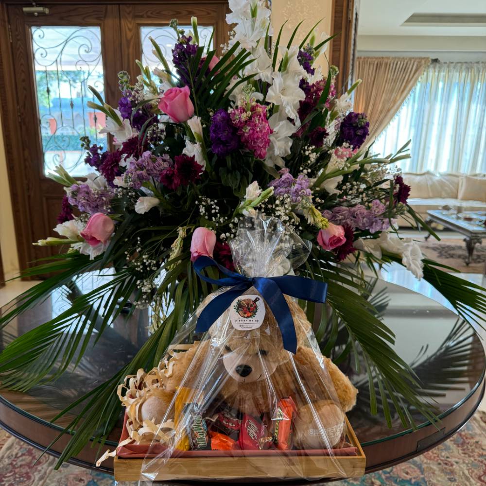 A 1-foot tall cuddly teddy bear paired with six delectable imported chocolate bars, creates the perfect gift combo for a sweet and cozy surprise on any special occasion.