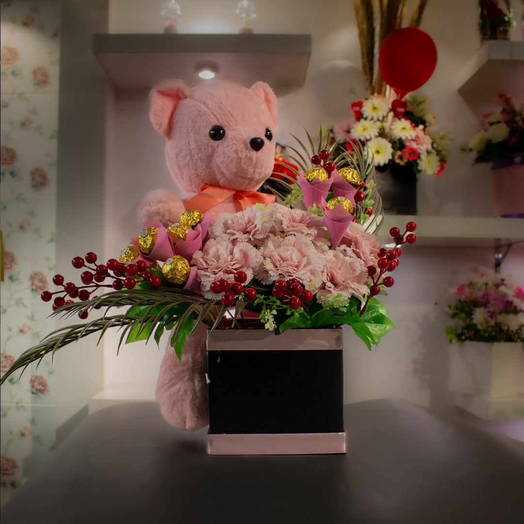 An absolutely adorable gift featuring a cuddly pink teddy bear hugging a beautiful arrangement of artificial pink carnations. Tucked within the everlasting blooms are 8 luxurious Ferrero Rocher chocolates, all presented in a chic box.