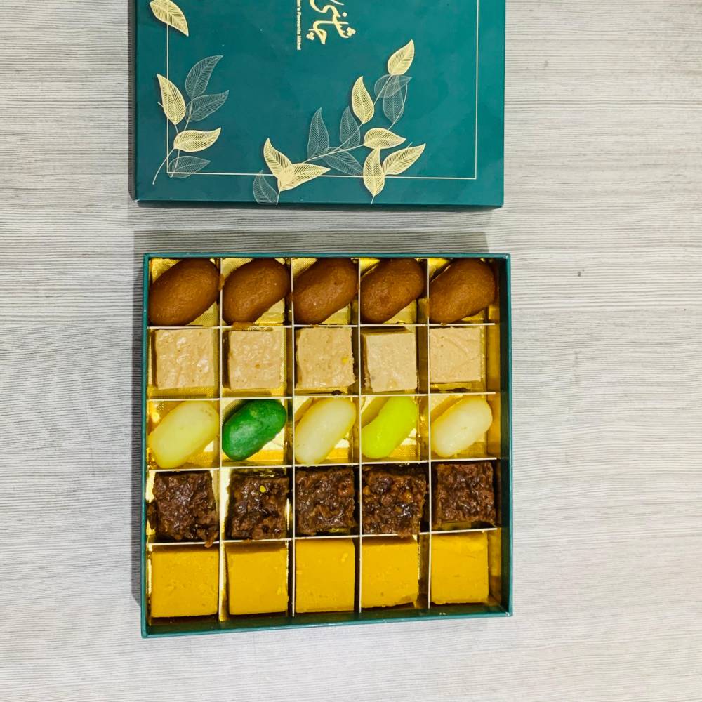 A rich assortment of traditional sweets, full of nostalgic charm and bold flavour. Whether it’s the syrupy indulgence of Jamun Lal or the deep, earthy notes of Habshi Halwa, this compact box brings together beloved classics perfect for heartfelt gifting.