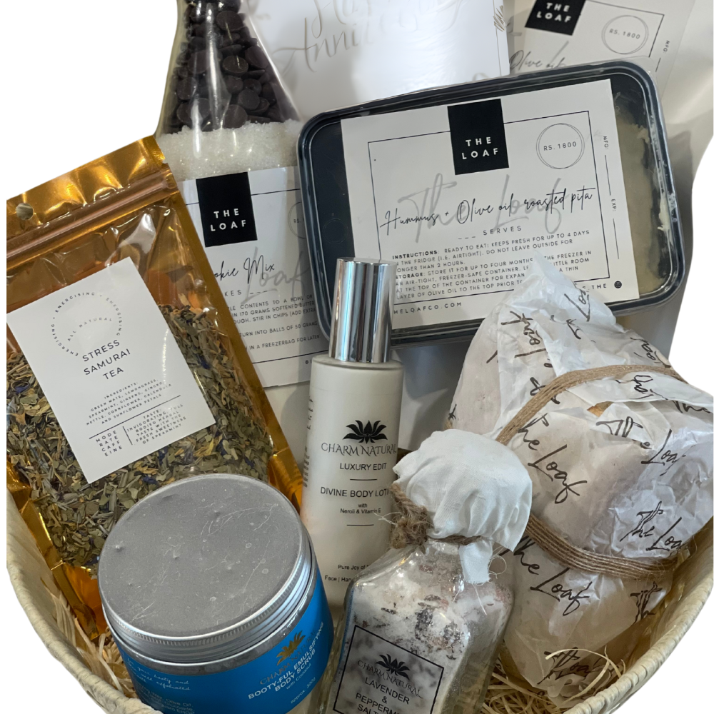 Unwind and indulge with our self-care basket, featuring a cozy basket overflowing with the calming scents of lavender and peppermint. Enjoy a soothing cup of herbal tea, savor the zesty flavors of hummus and fresh sourdough, and pamper yourself with our luxurious body lotion, bath salts, and body scrub.