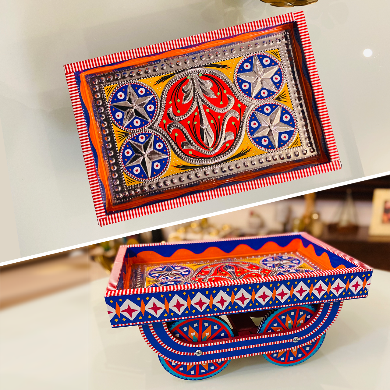 Wooden Base with Traditional Chamakpatti: A beautifully crafted wooden base adorned with intricate Chamakpatti sticker art, showcasing vibrant patterns and traditional designs. This unique piece combines artistry with natural elegance, making it a perfect decorative accent for any space.Description: